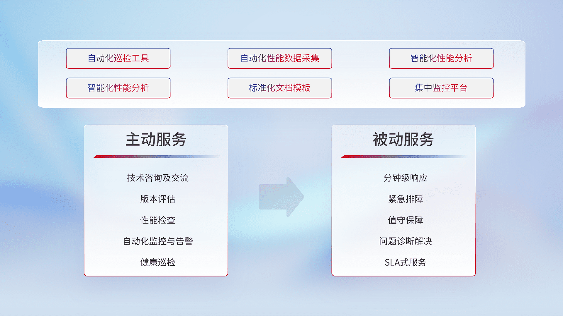 智能化工具和标准化文档,,,保障服务质量,,,提供主动服务(包含技术咨询、、、版本评估、、、性能检查、、、、自动化监控与告警、、健康巡检)和被动服务包含(分钟级响应、、、紧急排障、、、值守保障、、、问题诊断解决、、SLA服务)。。。。