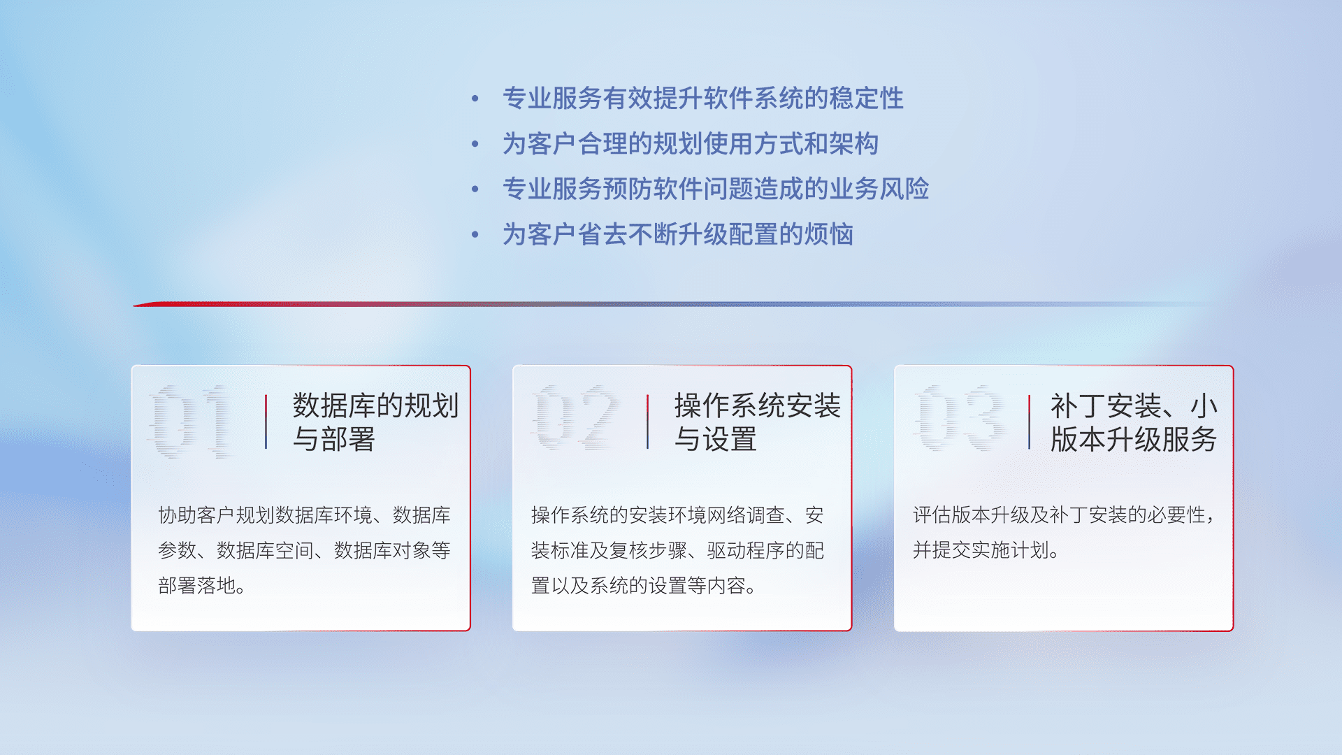 为客户提供软件规模升级、、、、快速部署、、按需配置的专业服务,,,从数据库的规划与部署到操作系统的安装与设置,,再到补丁安装和小版本升级提供支持。。。